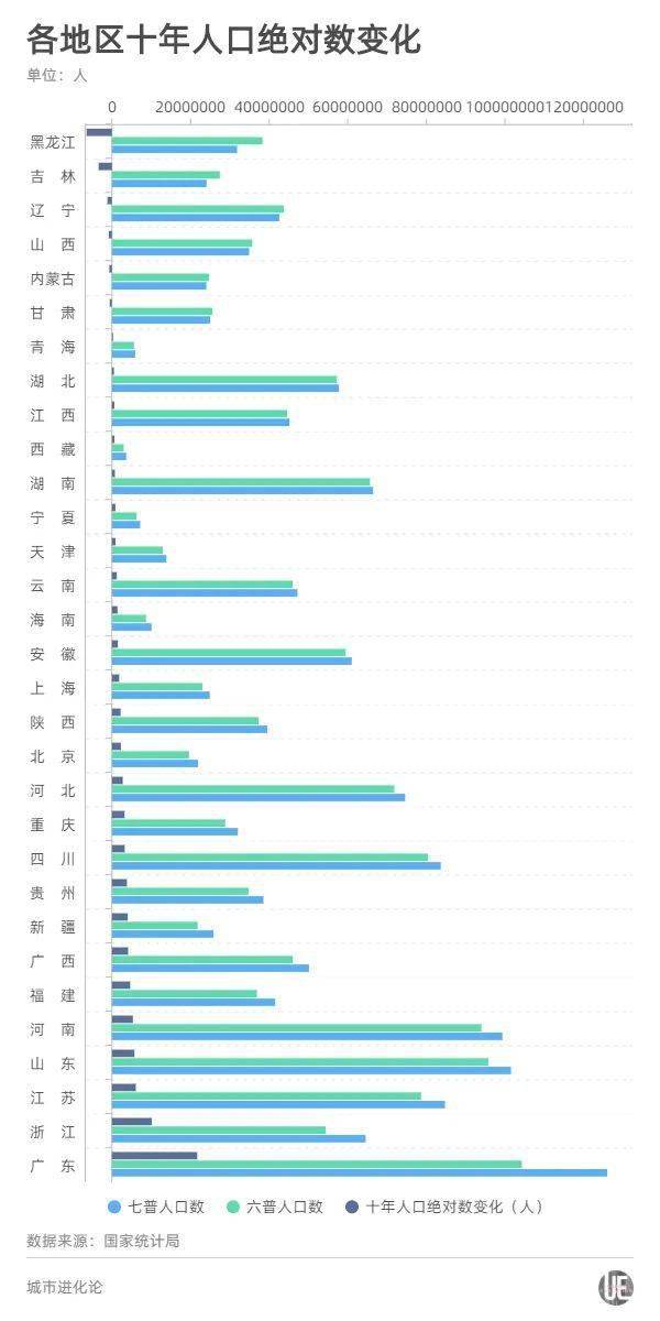 广东还是十年来人口绝对值增加最多的省份,增加了2171万人,浙江第二,增加了1014万人。近十年来,人口绝对值出现减少的省份共6个,东北地区三个省份全面减少,黑龙江减少得最多,为646万人。其他区域如山西、内蒙古、甘肃也出现了不同程度的人口规模减少。