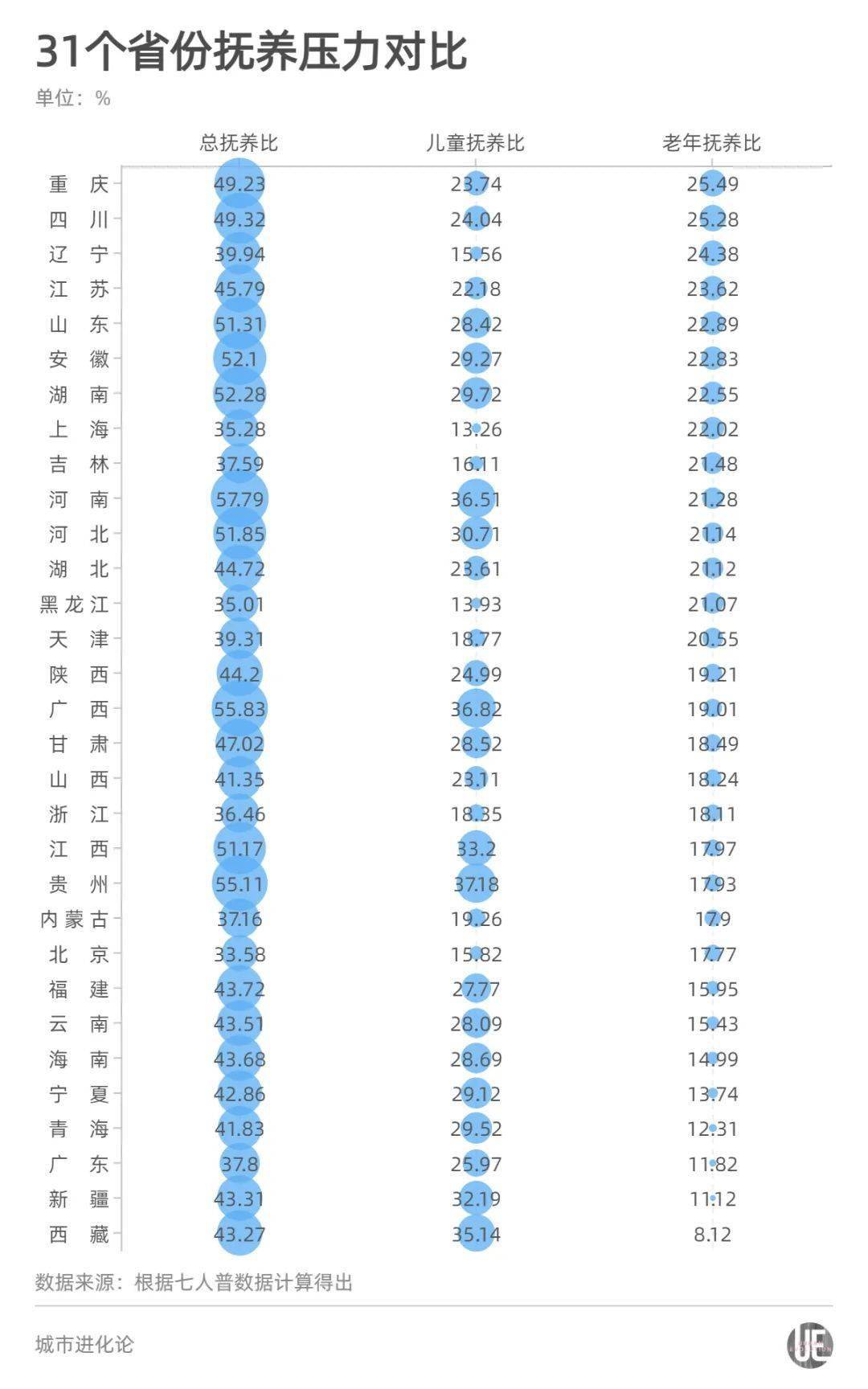 论儿童抚养比,贵州、广西、河南、西藏、江西等5个省份儿童抚养比都在33%以上,3个劳动人口抚养1个儿童,也算是“甜蜜的负担”了。