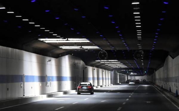 项目全线共有五大重要节点性工程,其中备受关注的庐州大道地下隧道工程目前已基本建成。记者进入隧道提前一览风景,见到整条隧道以蓝色为主基调,车子行驶在隧道里宛如在蔚蓝的海底遨游,双向六车道的道路笔直宽阔。在隧道中间顶部位置,有一段采取动态投影设计,通过画面展示和变化,可以体现合肥美丽风景和科创特色。