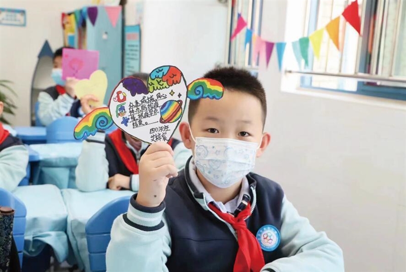 在合肥市奥体小学,同学们经过校门口测温和班级测温后,排队有序进入教室,重回校园后,同学们格外兴奋,他们手工制作了“同心抗疫”和“努力向前冲”的卡片,表达了一起加油的决心!