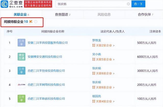 企查查APP显示,“疯狂小杨哥”张庆杨目前控制企业有8家,间接持股企业10家,并在其中5家担任法定代表人,包括合肥三只羊创业投资有限公司、合肥三只羊网络科技有限公司、合肥领头羊文化传媒有限公司等,商业版图涉及文化传媒、直播电商、创业投资、供应链管理、交通设施等。