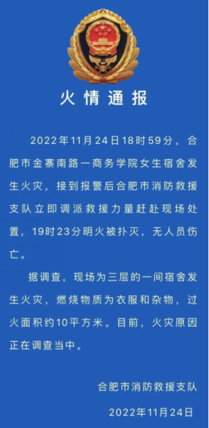 据合肥消防在线公众号11月25日消息 11月24日,合肥市消防救援支队发布火情通报称, 2022年11月24日18时59分,合肥市金寨南路一商务学院女生宿舍发生火灾,接到报警后合肥市消防救援支队立即调派救援力量赶赴现场处置,19时23分明火被扑灭,无人员伤亡。
