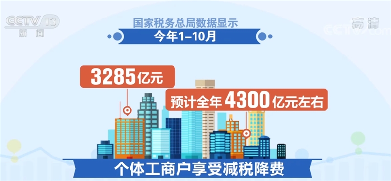 国家税务总局数据显示,今年1—10月,个体工商户享受减税降费3285亿元,预计全年4300亿元左右,随着“六税两费”减征政策进一步扩围至个体工商户,税费优惠政策已覆盖全部个体工商户。
