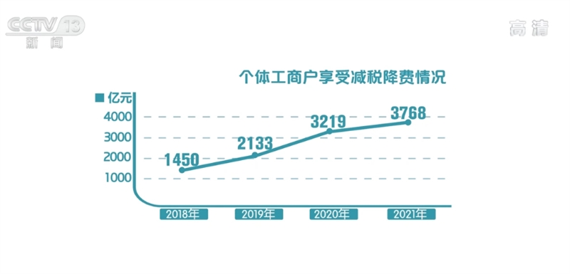据了解,2018年以来,我国已经累计为个体工商户减税降费13855亿元,其中,减税13567亿元,降费288亿元。分年度来看,2018年到2021年,个体工商户享受减税降费分别为1450亿元、2133亿元、3219亿元和3768亿元,规模逐年扩大。