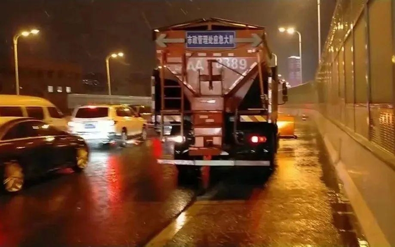 除雪车正在路面铺撒融雪剂。全媒体记者 王骏超 摄
