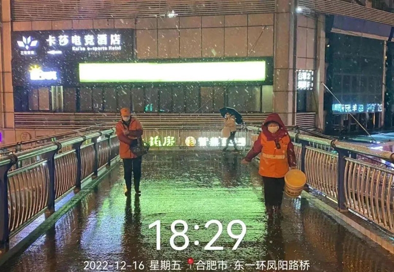 瑶海城管局今天17时起启动应急预案,并落实24小时值班制度。组织人员奔赴城区各主要道路开始除雪作业。环卫工人在人行道、非机动车道、人行天桥、公交站台、地铁口等地抛撒融雪剂融雪,确保清除冰雪工作高效快速。