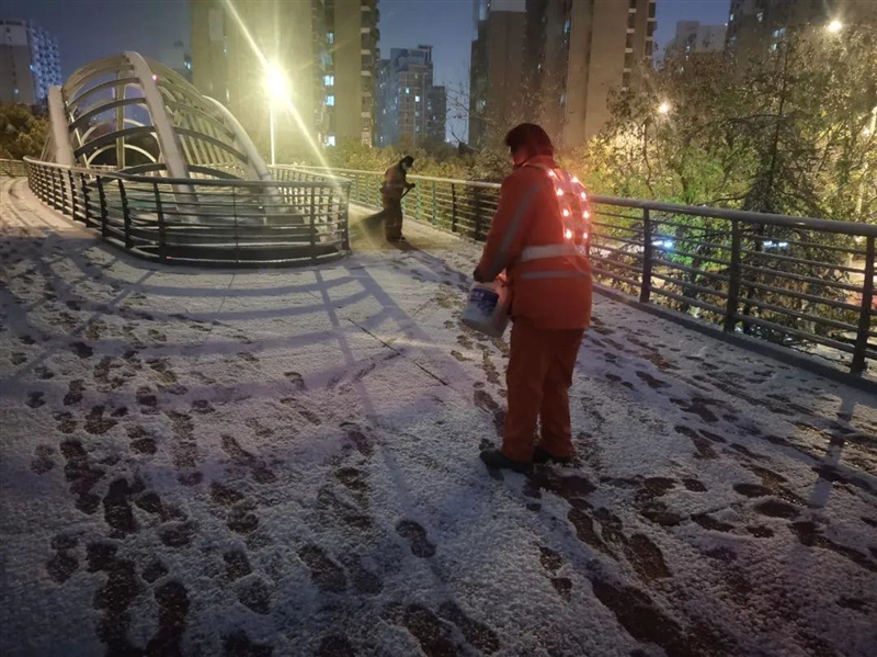 高新区城管局分片区对西二环路与黄山路交口人行天桥、方兴大道和云飞路人行天桥等,采用人工布撒融雪剂,重点路段采用机械撒布融雪剂,全力保障市民出行安全。