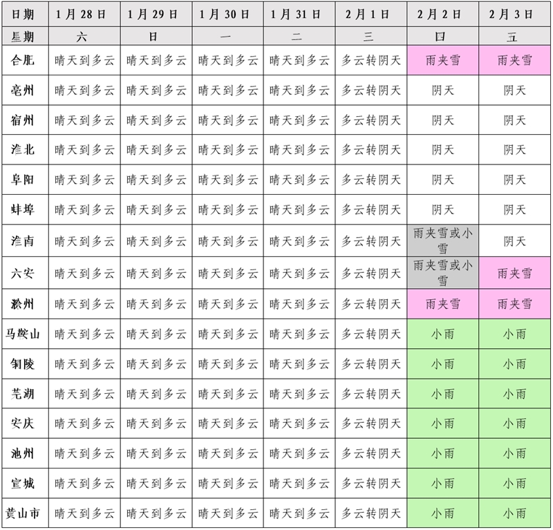 1月28日,安徽省气象台预报,预计28-31日全省以晴到多云天气为主,2月2日后我省南部多阴雨雪天气,其中2-3日江淮之间和皖南山区有雨夹雪或雪。