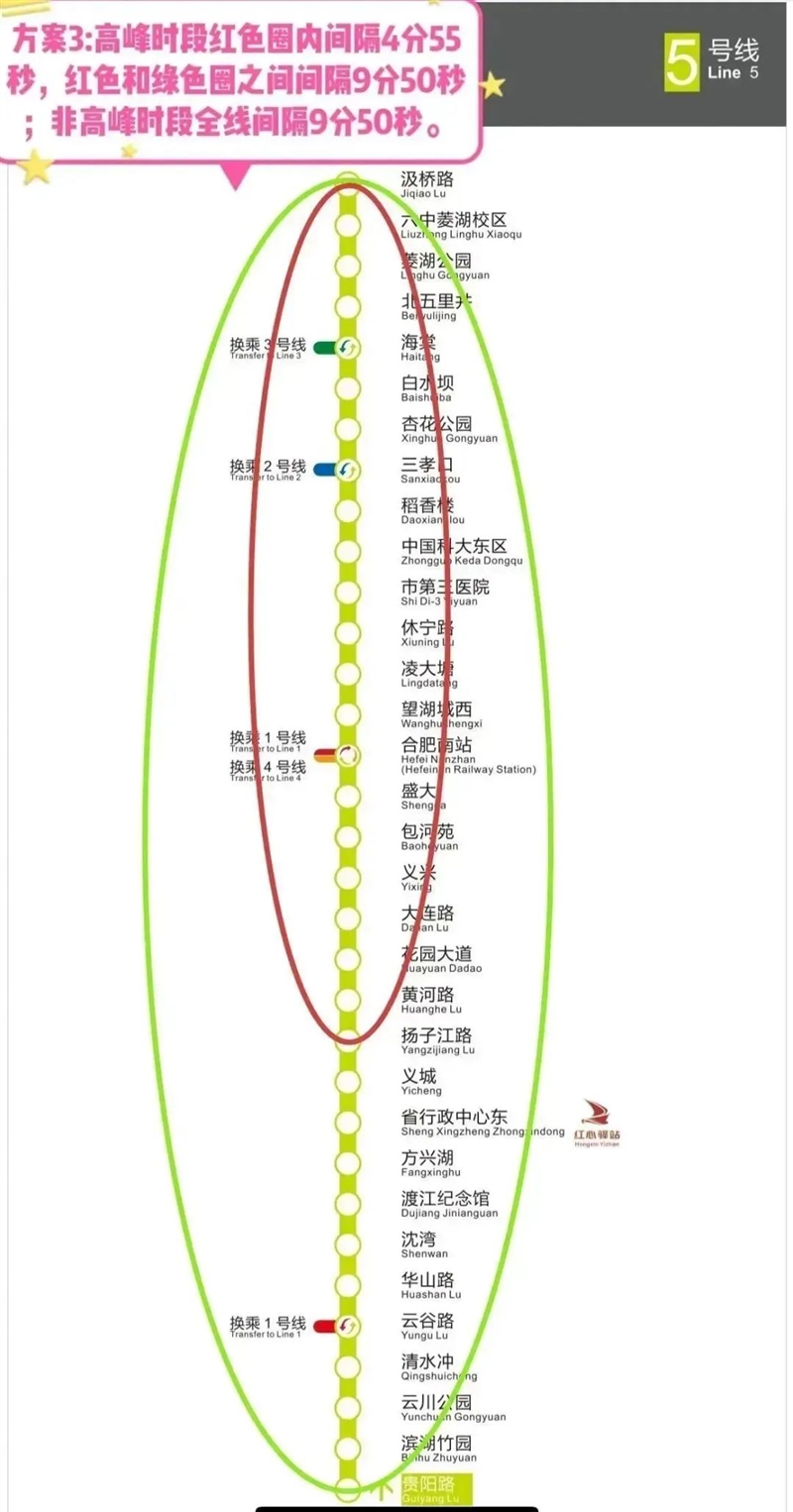(执行此方案,高峰时段包河苑站至汲桥路站行车间隔压缩到最短,贵阳路站至包河苑站乘客高峰期出行需耐心等待。)