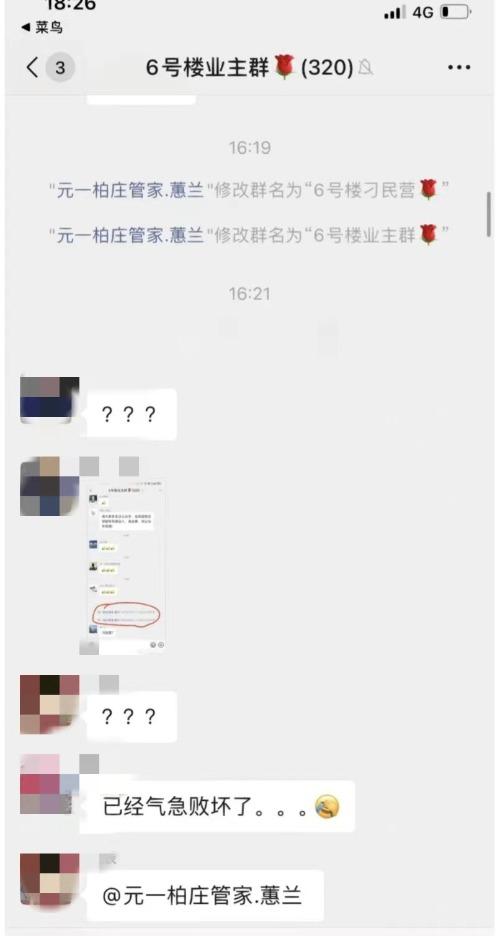 大皖新闻记者从发布内容中看到,15日下午16点19分,“元一柏庄管家.蕙兰”修改群名为“6号楼刁民营”,随后又将群名修改回“6号楼业主群”。在业主发现并质问下,该物业管家在业主群回复称,“各位业主朋友们,非常抱歉,因管家手机丢失,群名称被恶意篡改,给大家带来困扰深表歉意。目前我们已申请紧急找回微信流程,也请捡到我们工作手机的朋友能够及时归还,深表感谢!”但是业主对这一解释并不认可。