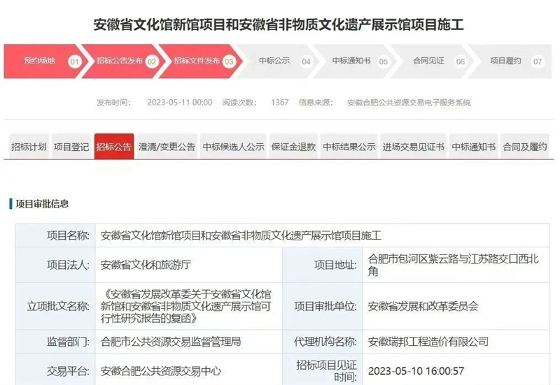 根据招标公告,安徽省文化馆新馆项目和安徽省非物质文化遗产展示馆项目位于包河区紫云路与江苏路交口西北角,总用地33700平方米,总建筑面积32400平方米,其中地上建筑面积23402平方米,地下建筑面积8998平方米。建筑地上5层(含设备机房层),地下1层,地上建筑高度23.85米,其中局部主舞台高度为34.5米(包括室内外高差),最大跨度71.70米的甲类公共建筑。