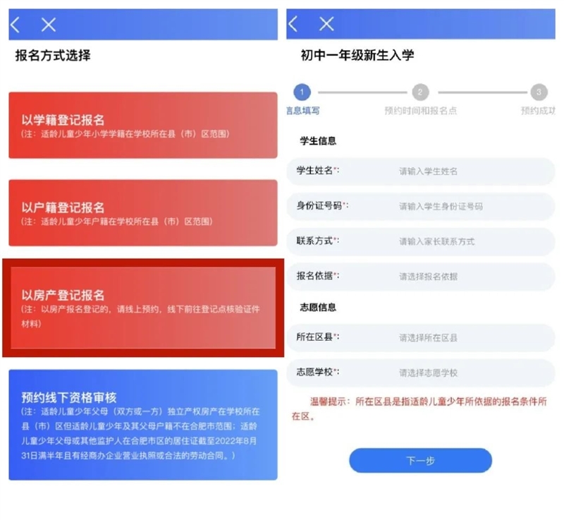 第四步:选择学籍、户籍、房产、预约线下报名等任一方式进行报名登记