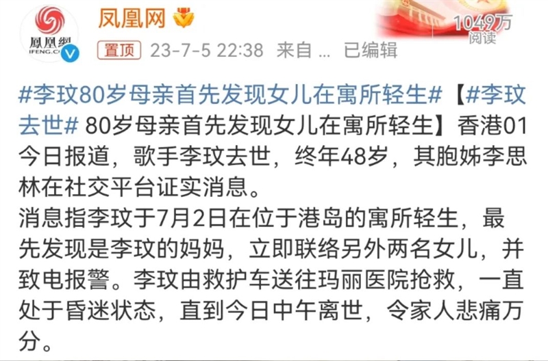 有消息称:李玟于7月2日在位于港岛的寓所轻生,最先发现是李玟的妈妈,立即联络另外两名女儿,并致电报警。李玟由救护车送往玛丽医院抢救,一直处于昏迷状态,直到昨日(5日)中午离世,令家人悲痛万分。