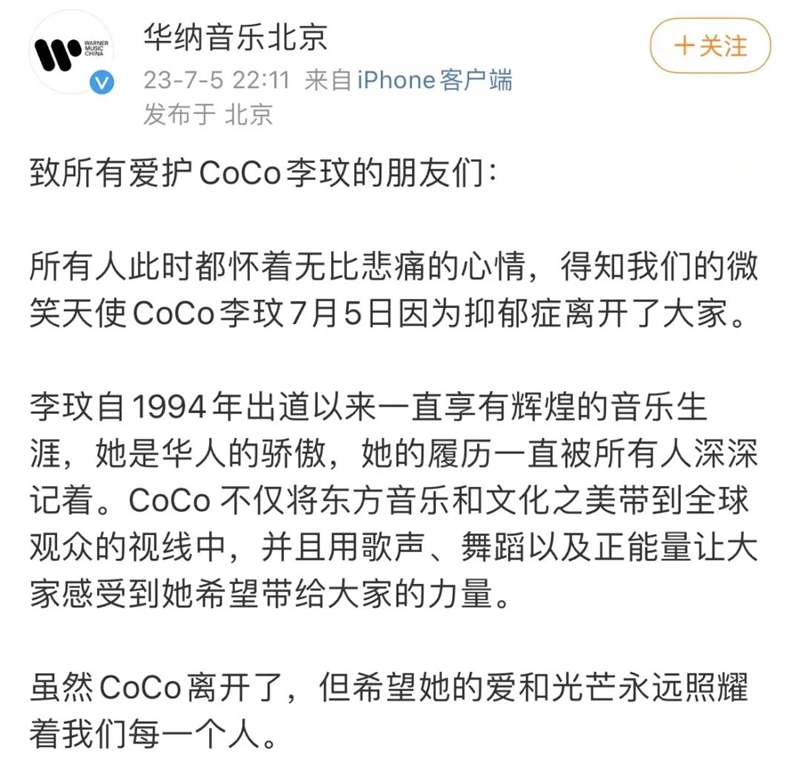 @华纳音乐北京 5日发博悼念李玟:所有人此时都怀着无比悲痛的心情,得知我们的微笑天使CoCo李玟7月5日因为抑郁症离开了大家。