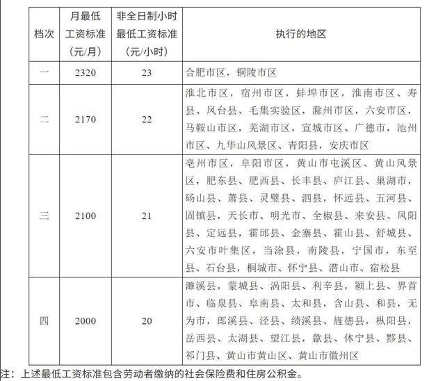 根据国家相关法律法规,并综合考虑安徽省当前经济社会发展水平,经省政府批准,新的月最低工资标准划分为四个档次,依次为2320元、2170元、2100元和2000元;非全日制小时最低工资标准也相应设定四档,分别为23元、22元、21元和20元。