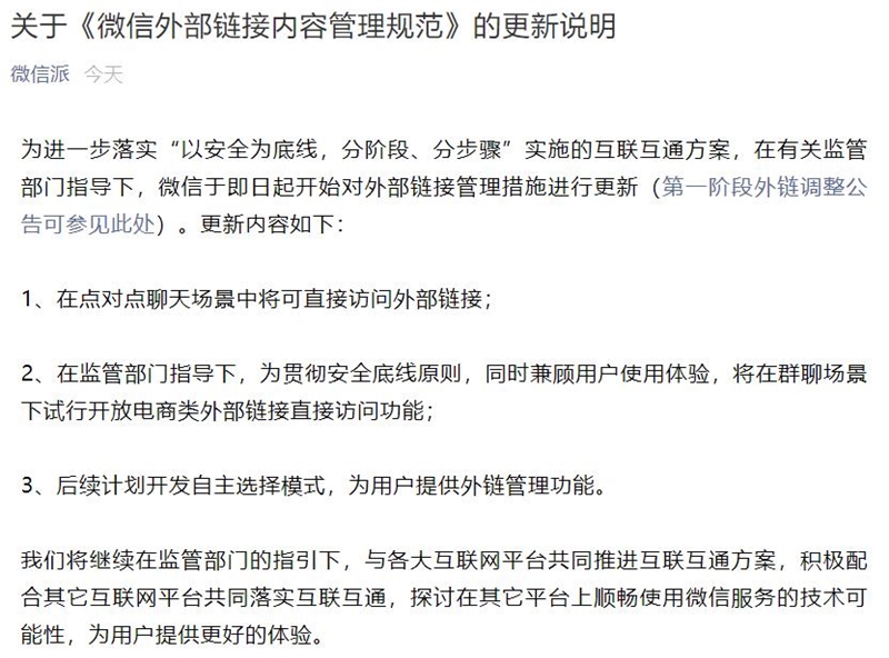 11月29日,微信发布《关于〈微信外部链接内容管理规范〉的更新声明》,公布在监管部门指导下进一步的互联互通方案,点对点聊天场景中将可直接访问外部链接,并将在群聊场景试行开放电商类外部链接直接访问功能。据悉,该功能将陆续生效。